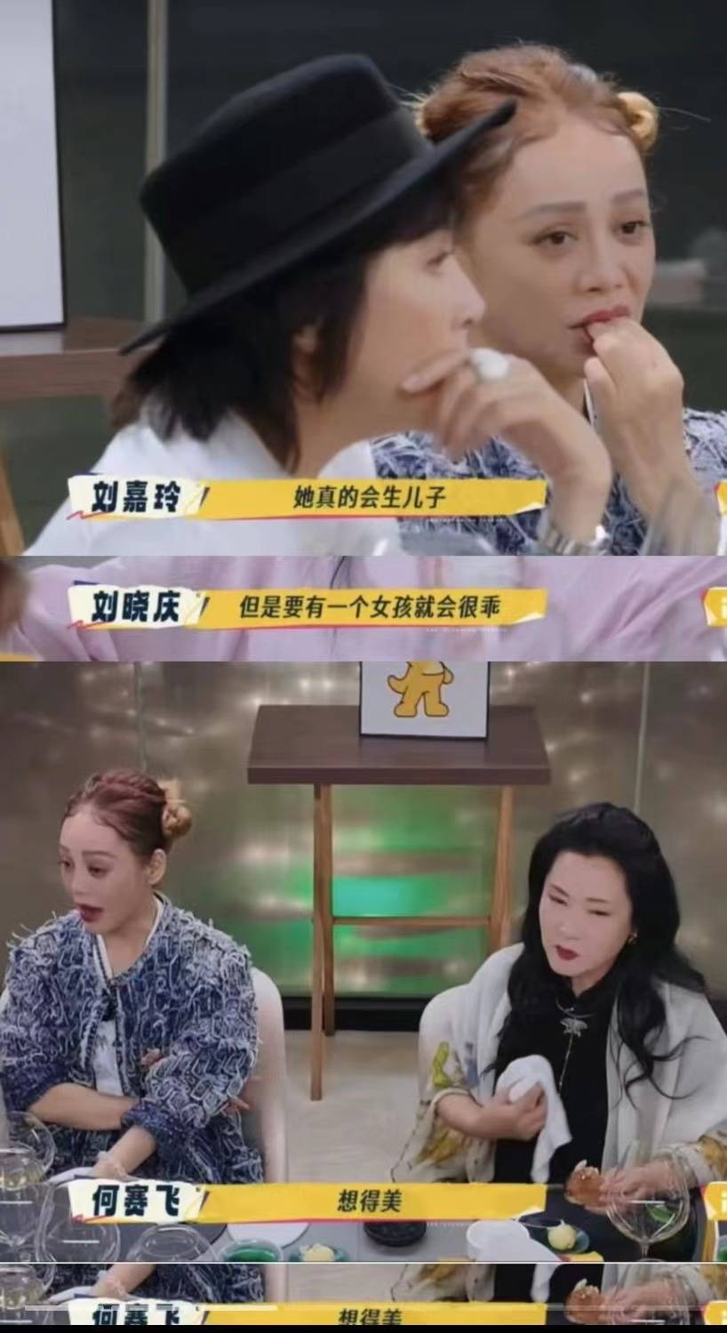 刘嘉玲认为张柏芝会生儿子,刘晓庆说生个女儿就乖了,何赛飞说想得美。何赛飞生的也是儿子,但后来没再生,可能很忙吧?