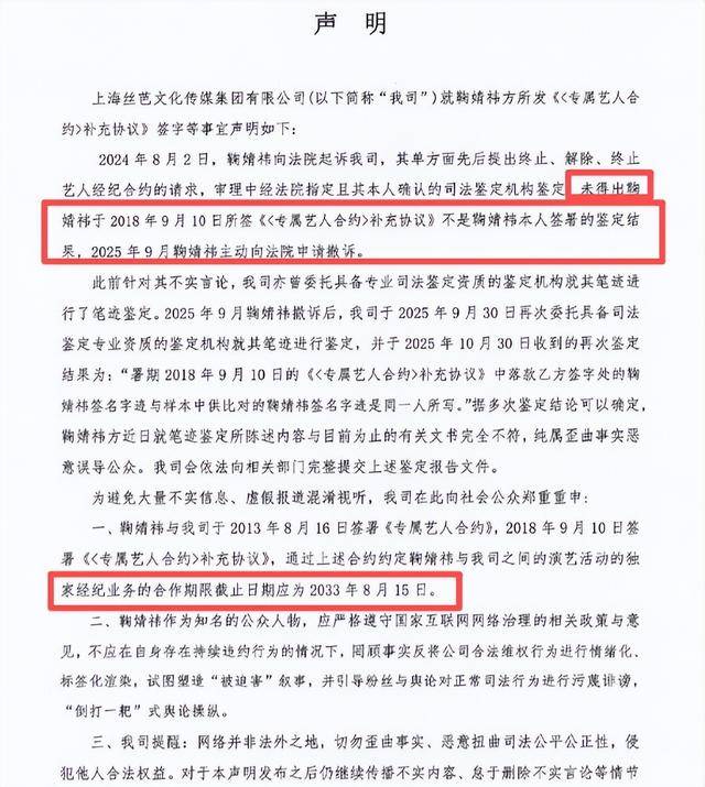 结果紧接着鞠婧祎工作室就炸了,直接甩出重磅炸弹:合约早就到期了,我们不续约!还说丝芭那边伪造什么补充协议,想把合约延长到2033年。