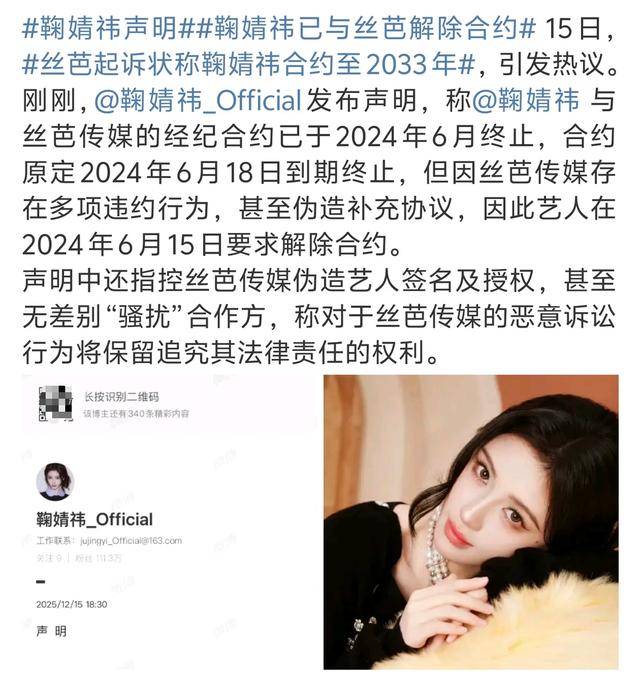 本来鞠婧祎和丝芭传媒的合约是到2025年10月底到期,大家都以为会和平分手,毕竟合作这么多年,好聚好散。