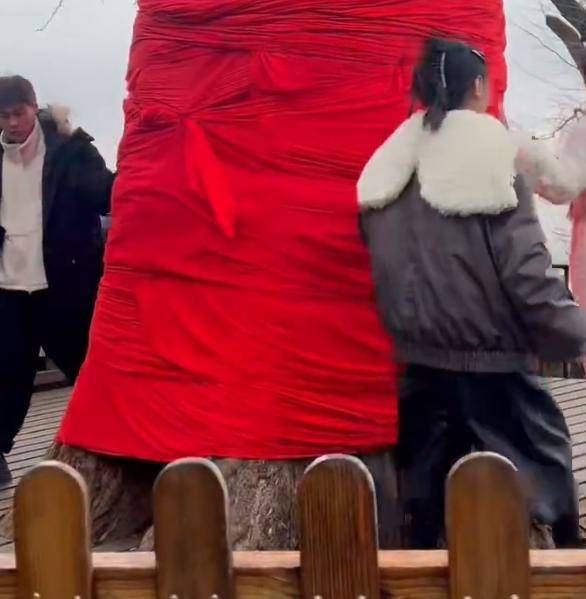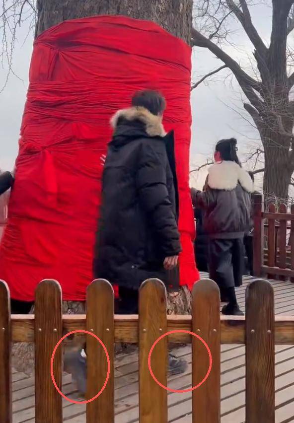 画面中,李易峰穿着黑色的大羽绒服,后面跟着一两个工作人员,围着大孤山那棵裹着红布的大树,一连转了好几圈,不知在祈福着什么。