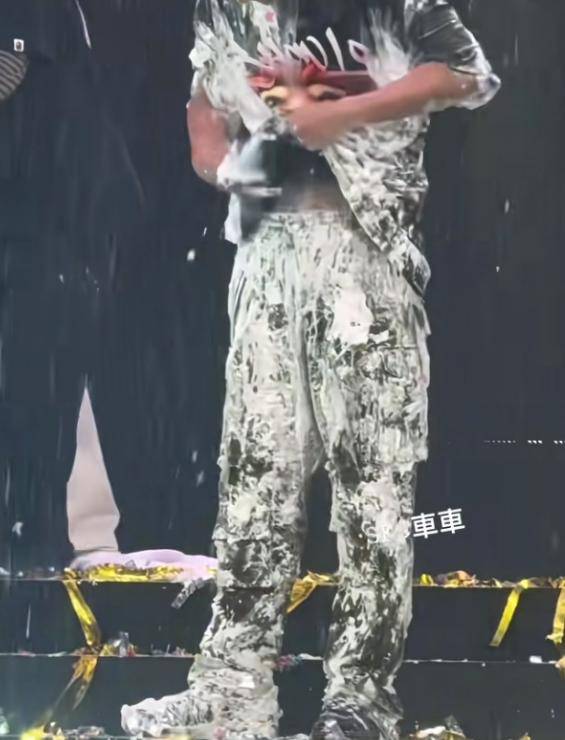 他在最新演唱会上为了营造舞台效果,被一盆白色泡沫从头浇到尾,整个人都变成了落汤鸡。