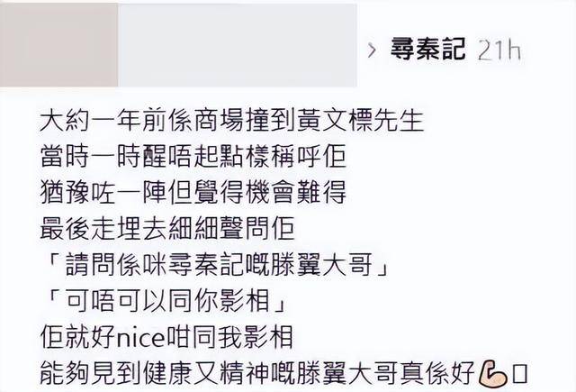 随着《寻秦记》热度的不断飙升,各大平台不少网民热议,近日有网民在他的社交网上发帖,表示自己大约在一年前,在商场偶遇了黄文标。