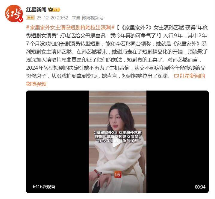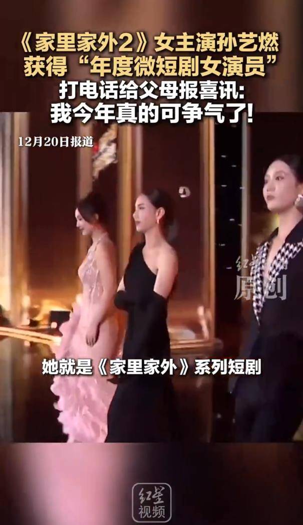 改变是立竿见影的。凭借这部系列剧,孙艺燃不仅迅速摆脱了经济困境,今年更是攒下了钱,为父母翻修了老家的房子。更让她没想到的是,职业荣誉也随之而来。在2025年底的行业颁奖礼上,她凭借“蔡晓艳”这个深入人心的角色,一举斩获“年度微短剧女演员”大奖。站在领奖台上,与前辈李若彤同框,她激动哽咽,第一时间通过电话向父母报喜:“以前总让你们操心,现在能给你们修房子了!”这一幕,被网友称为“年度治愈瞬间”。
