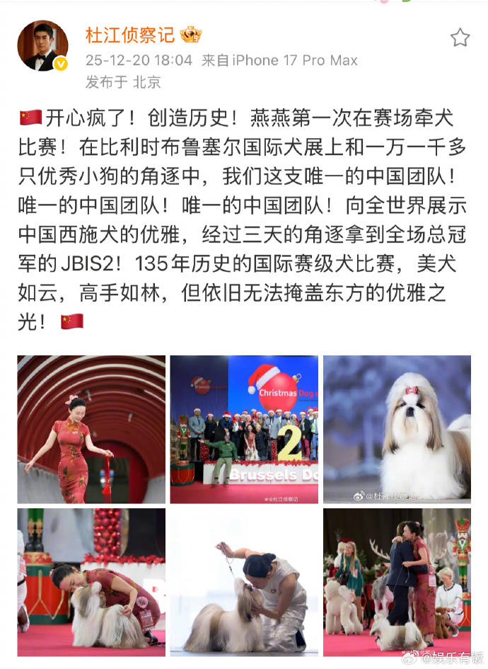丈夫杜江在社交平台激动发文:创造历史!燕燕第一次在赛场牵犬比赛!在比利时布鲁塞尔国际犬展上和一万一千多只优秀小狗的角逐中,我们这支唯一的中国团队!唯一的中国团队!唯一的中国团队!杜江的这连发三遍:“唯一的中国团队!”——这声呐喊,定格了历史性的一刻。
