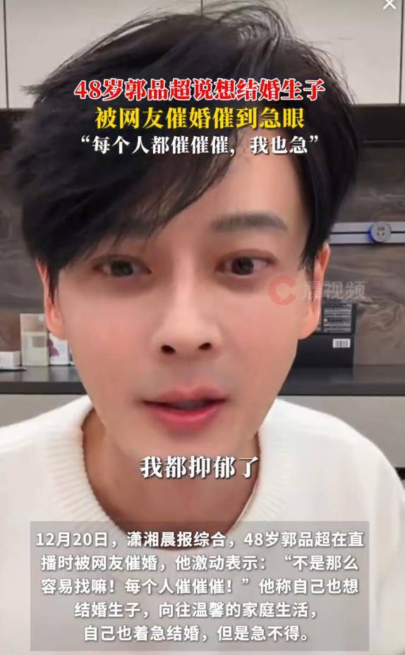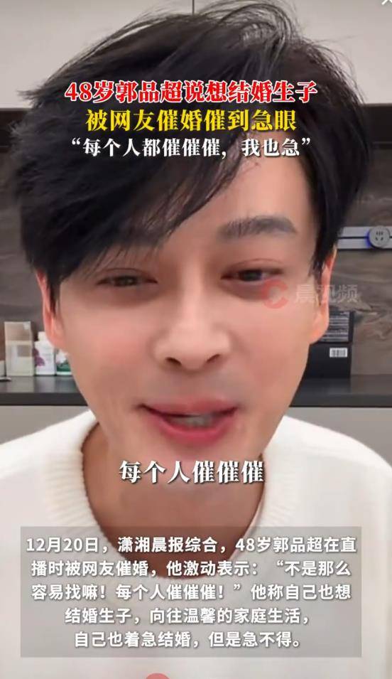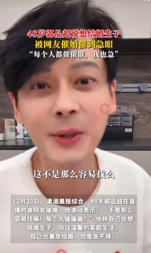 “不是那么容易找嘛!每个人催催催!我也着急结婚”。12月20日,48岁的演员郭品超在直播中面对铺天盖地的催婚弹幕,情绪激动地脱口而出。这句带着无奈与焦灼的回应,瞬间