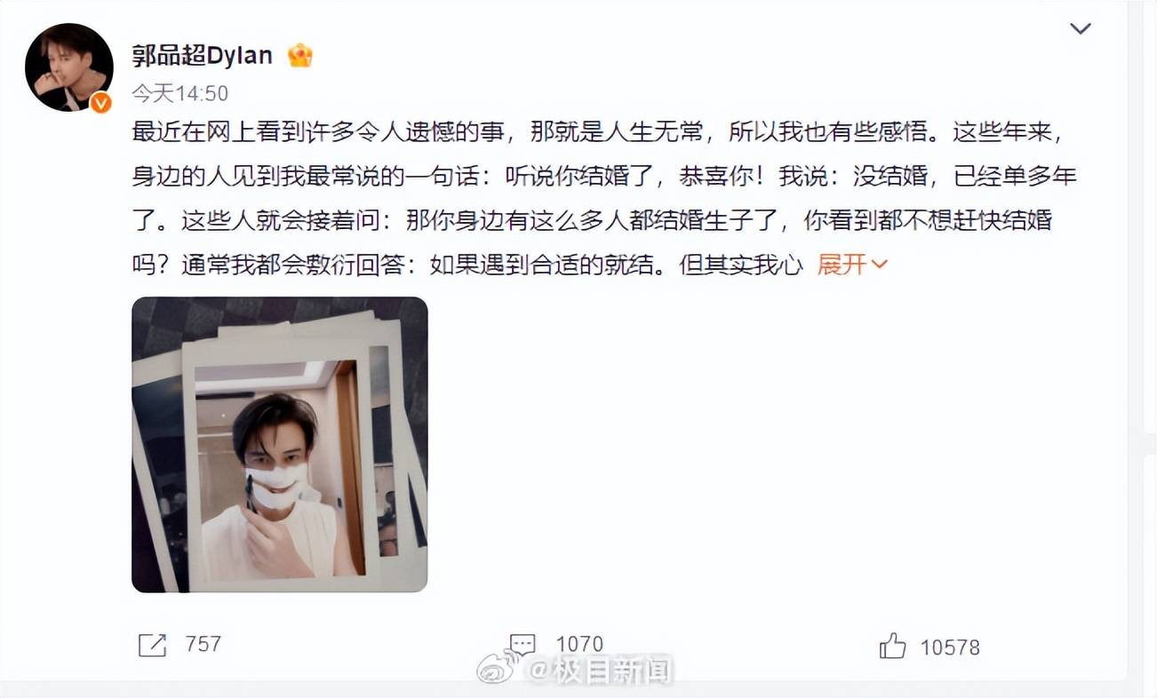 今年2月21日,郭品超就曾以一篇罕见的长文,将这种私人压力公之于众。他不仅明确宣告自己“没有结婚、单身多年”,更以“不见外”的口吻,分享了被催婚催生的愤懑。文中描绘了一个尴尬的日常循环:身边人见面总说“听说你结婚了,恭喜!”,他只能反复澄清“没结婚”,紧接着便要面对“那看到别人都结婚生子了,你不想赶快吗?”的灵魂拷问,最终往往只能以“遇到合适的就结”敷衍收场。