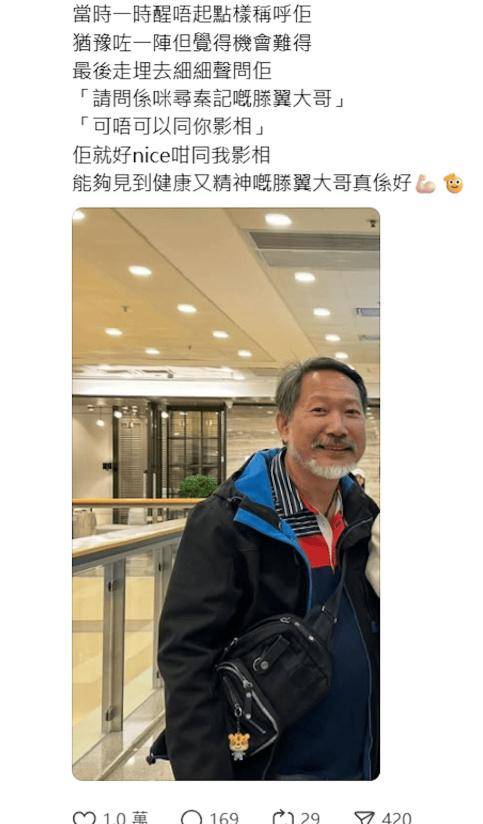 该网友上前搭话认人,问道:“请问您是不是《寻秦记》里的滕翼大哥?”黄文标不仅没有拒绝,还非常有礼貌地答应了合照请求,被赞人好到爆!照片中可见,黄文标身穿便服,笑容慈祥,完全没有昔日剧中恶人的戾气,反而多了一份慈祥大叔的亲切感。