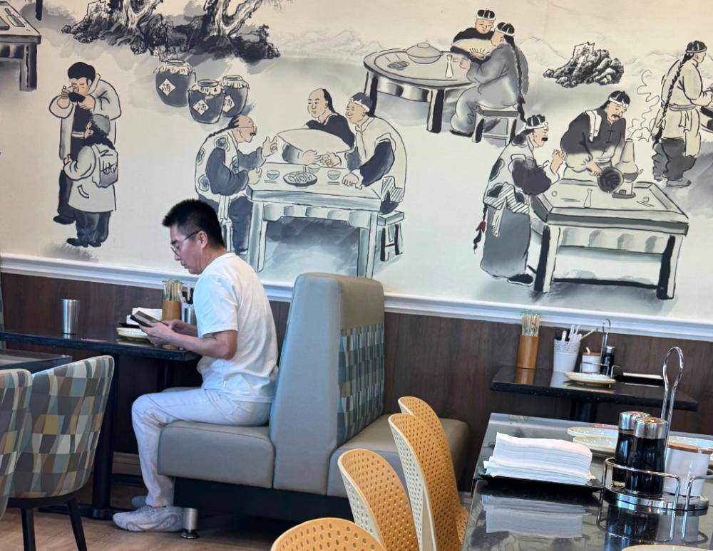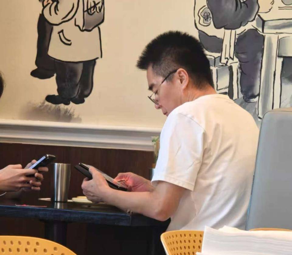 最近又有网友曝光了她前夫许亚军的近况,原来他现在仍然待在美国,身穿白色短袖,坐在餐厅看着手机。