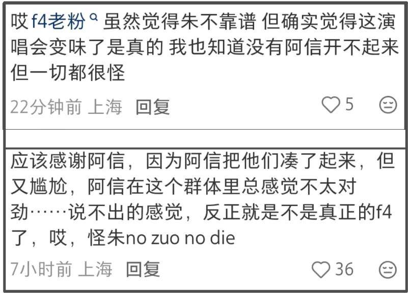 当然了,演唱会现场上万观众,每个人的感受肯定是不同的,只能说F3和阿信的演唱会终究还是代替不了F4合体。