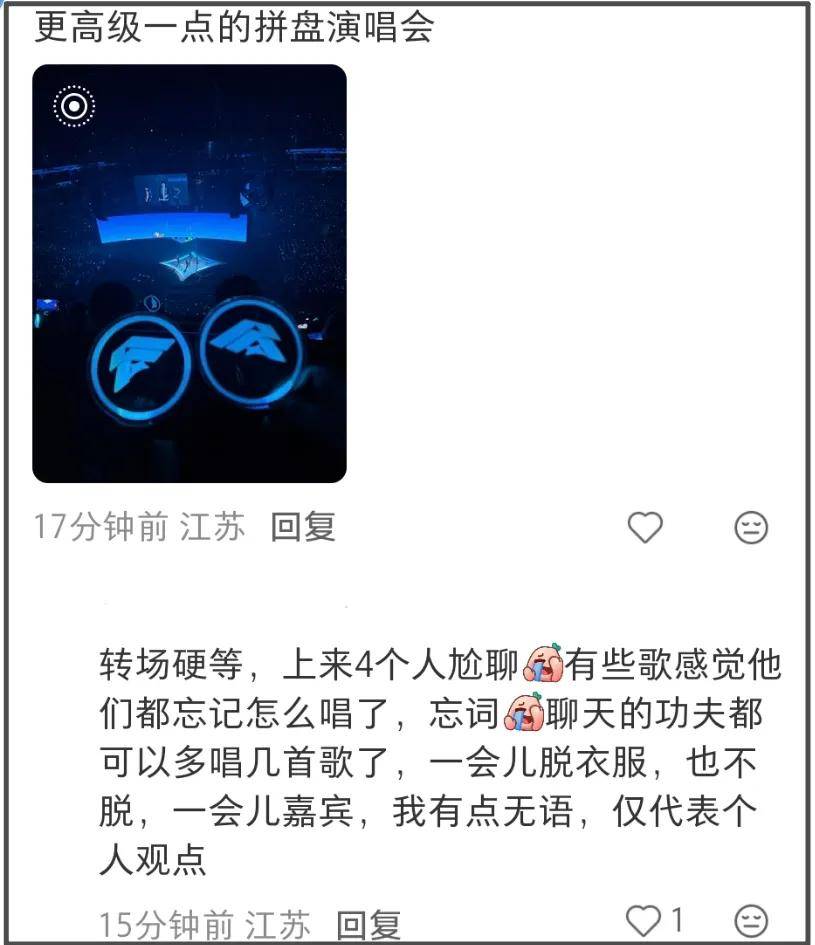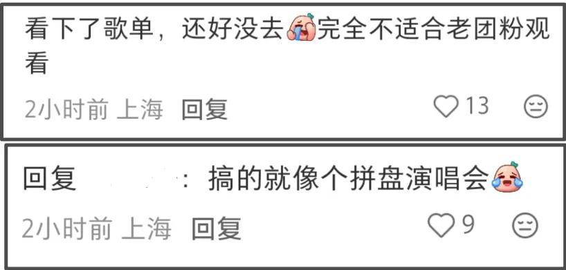 古早组合合体或者老一辈开演唱会,其实就是卖个情怀,一旦现场观众感受不到情怀,觉得无非就是一场拼盘,对整个演唱会观感就会下降,对一些瑕疵容忍度就会变低了。