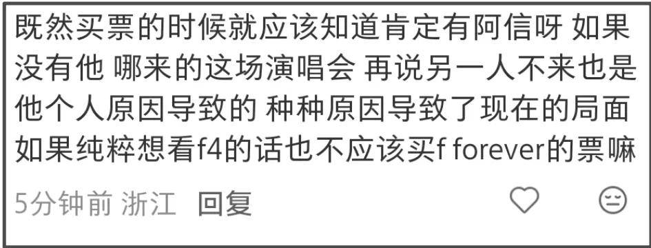 如果一心想看F4全员,只对F4组合有情怀,那F3演唱会还是不行,买票之前要考虑清楚,能不能接受阿信和F3一同出镜,毕竟整场演唱会的名字是F✦FOREVER恒星之城,而不是F4合体。
