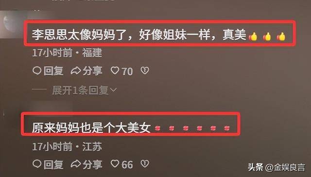 有网友调侃:“原来颜值天花板在妈妈这里,李思思只是遗传了妈妈的冰山一角。”