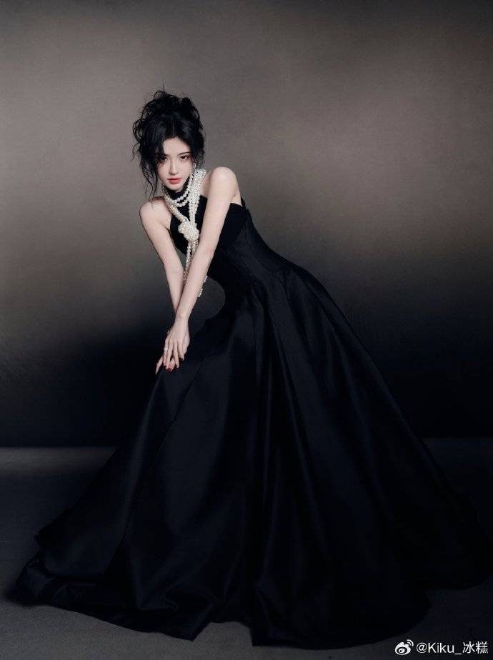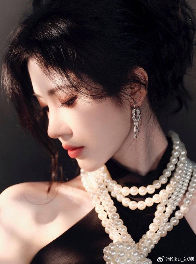 鞠婧祎身着黑色露肩丝绒长裙,搭配法国珠宝品牌FRED斐登定制的多层珍珠项链,项链从锁骨延伸至胸前,随步履摇曳形成动态光影,美得让人窒息。