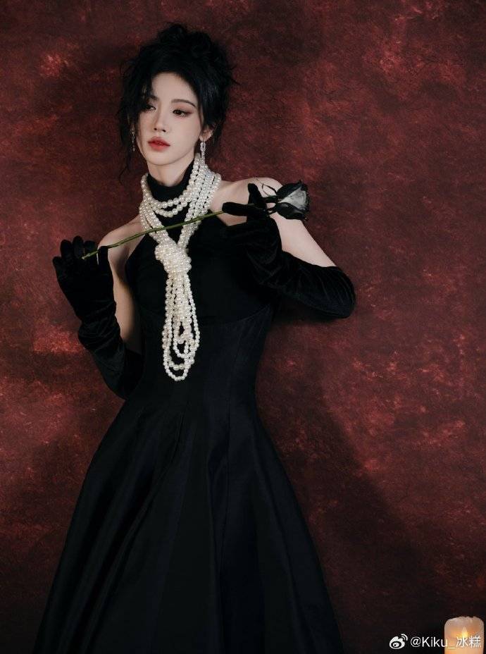她的同色系丝绒长手套与高颅顶盘发强化复古美学,整体风格被形容为“暗夜玫瑰”“黑天鹅公主”。