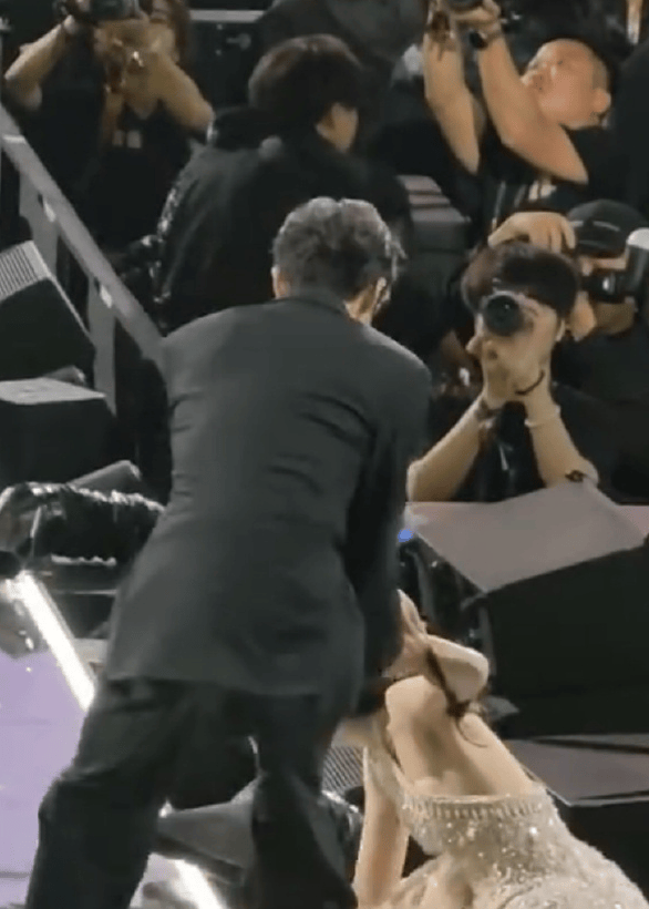 李昀锐不仅台上搀扶,下台时全程留意其裙摆,被网友调侃“昀牵孟绕”;白鹿在旁叮嘱“下次别摔了”;丞磊闻声立即转身协助,四人互动笑作一团。