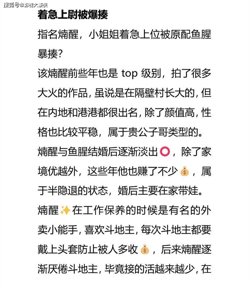 小道消息表示是以前火的顶流,在某社交平台有人爆料称:有位小姐姐着急上位结果被原配暴揍,男星前些年是top级别,拍了很多大火作品,在村里长大,但在内地香港都很出名,颜值高,性格好,归属于贵公子行列,男人结婚后逐渐淡出圈,婚后在家带娃,最初喜欢玩斗地主,后来就喜欢私下联系小姐姐,小姐姐还被安排在离家不远的地方,两人保持了长期关系。后来小姐姐发疯将两人做饭视频发给原配,原配于是上门抓个正着,还让男星先走,自己把小姐姐打成了熊猫眼,还揪了不少头发。