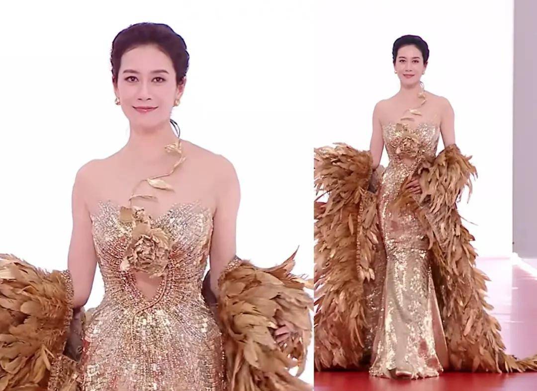 比陈都灵造型更华丽的是站在她身旁的温峥嵘——她穿了一条金色亮片长裙搭配金色羽毛披肩,华丽得就像曾经参加选美比赛的冠军,时隔二十多年后重回赛场当颁奖嘉宾并走秀的样子。