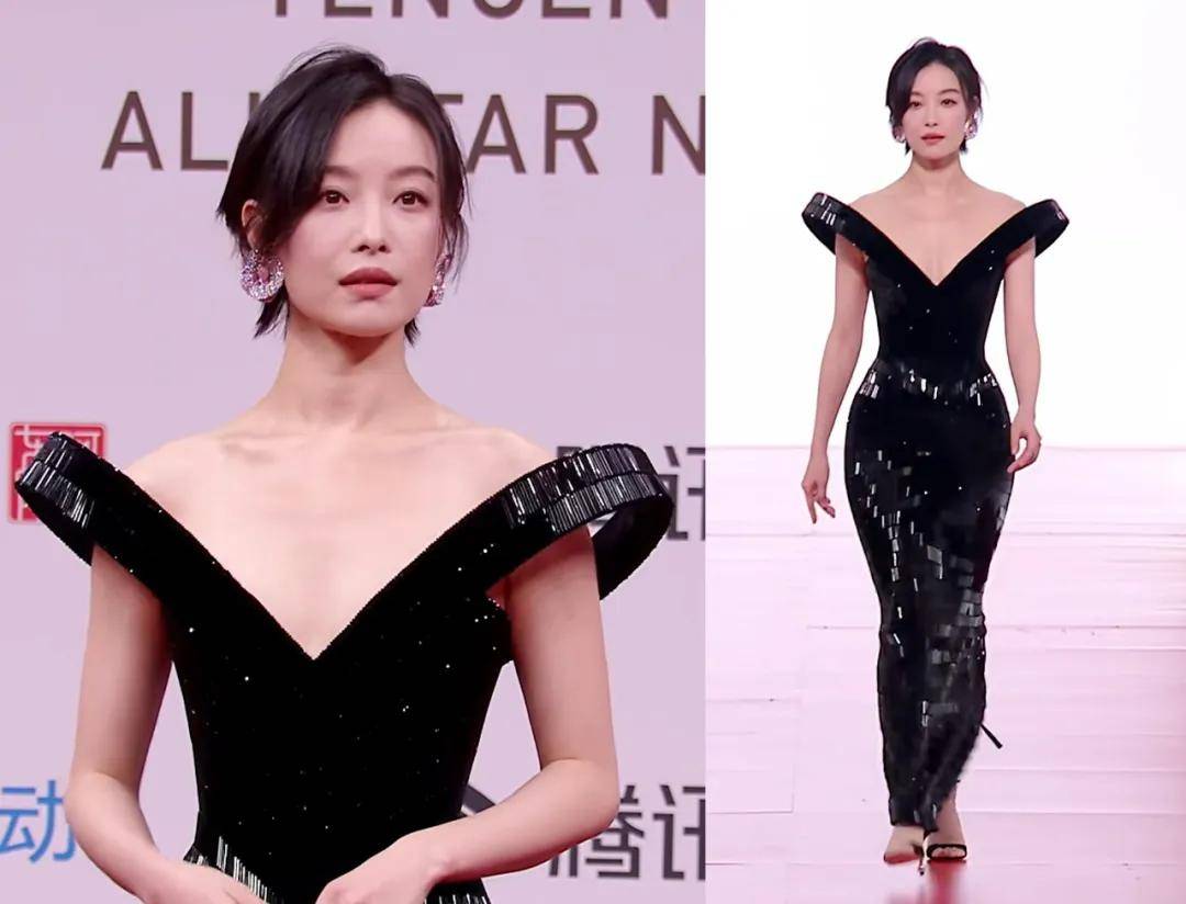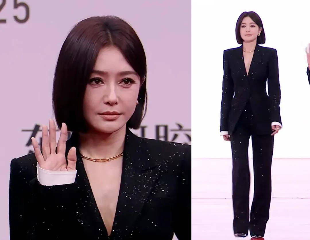 秦岚穿了一套黑色V领亮片西装,搭配标志性的短发,还是那么飒爽。
