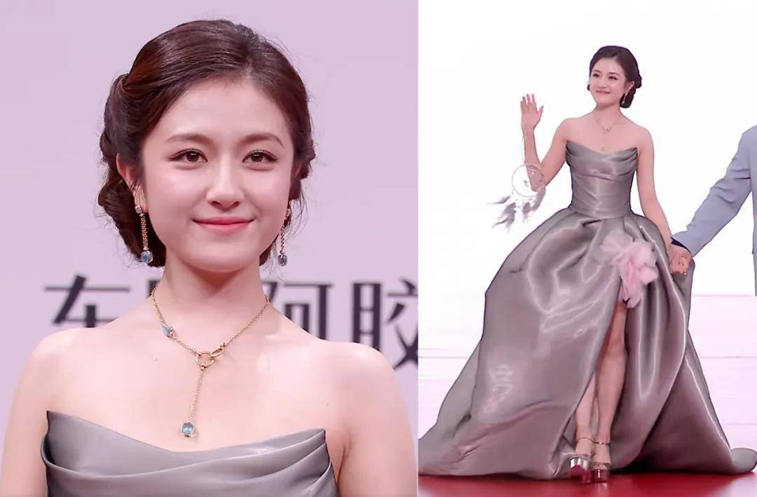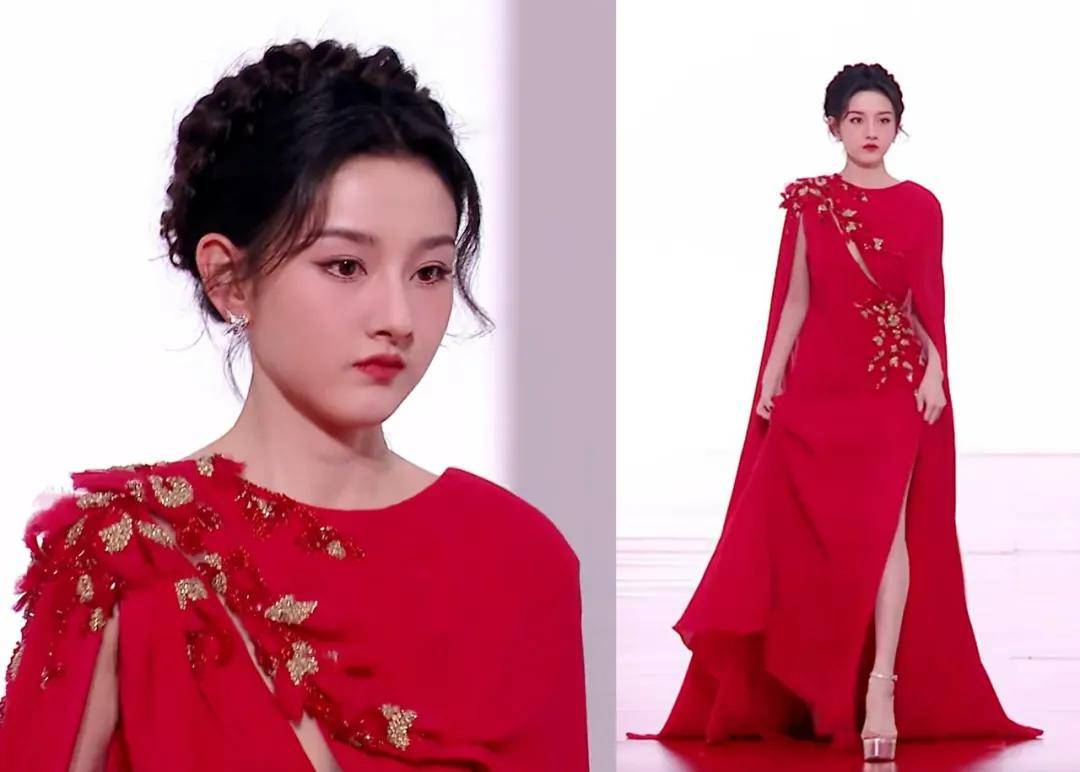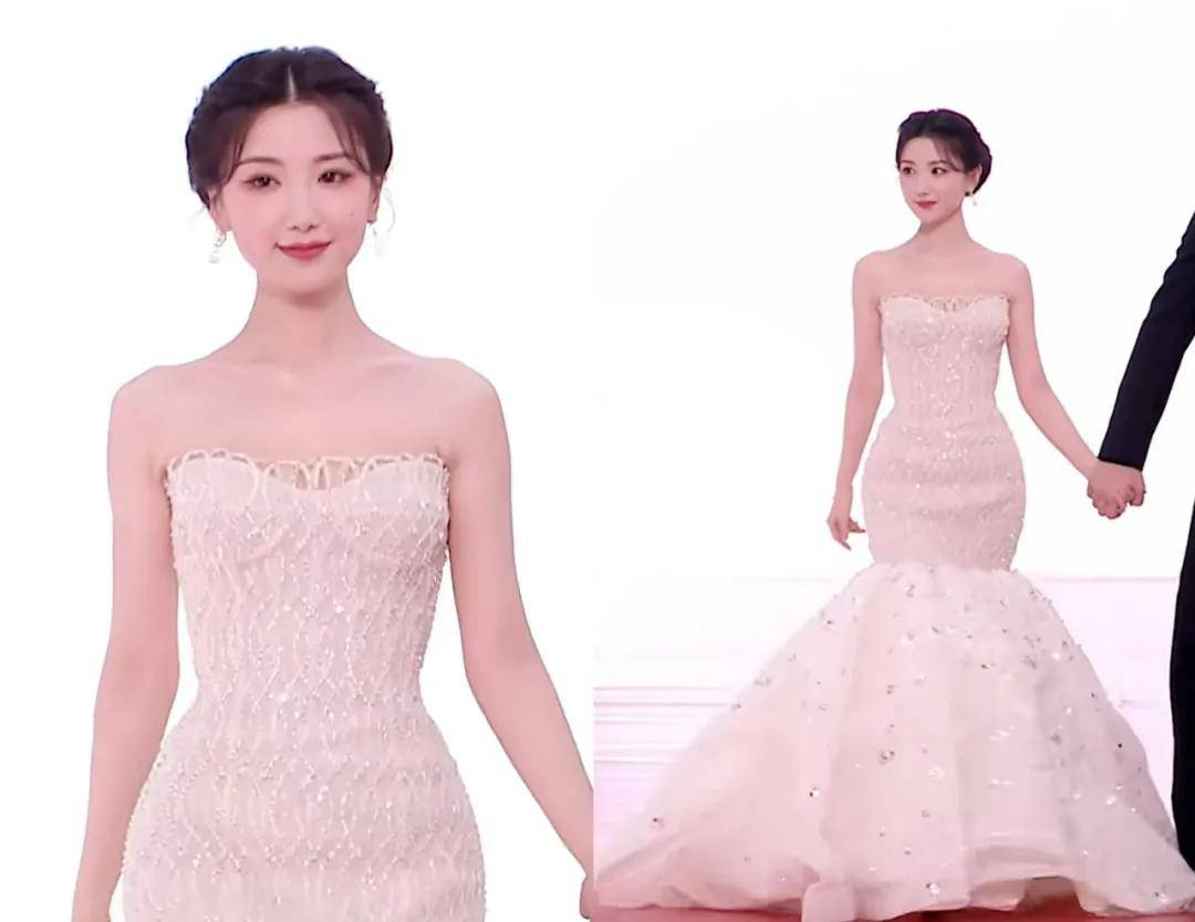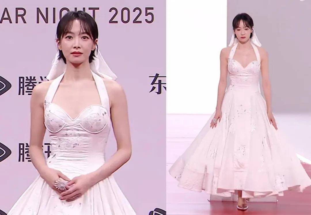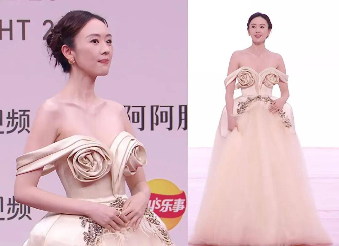 童瑶的妆发温柔大气,就是这条米色纱裙的设计有点看不懂,那两朵立体玫瑰花换个位置会不会没那么奇怪?