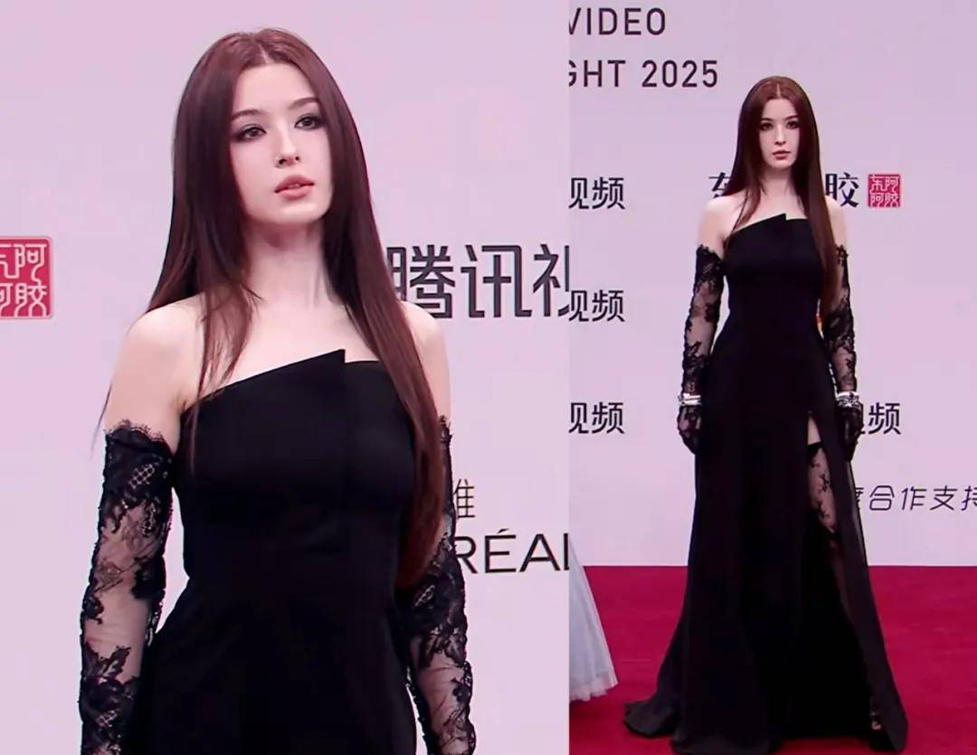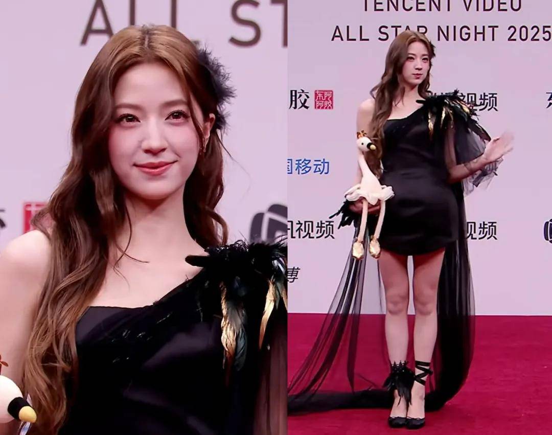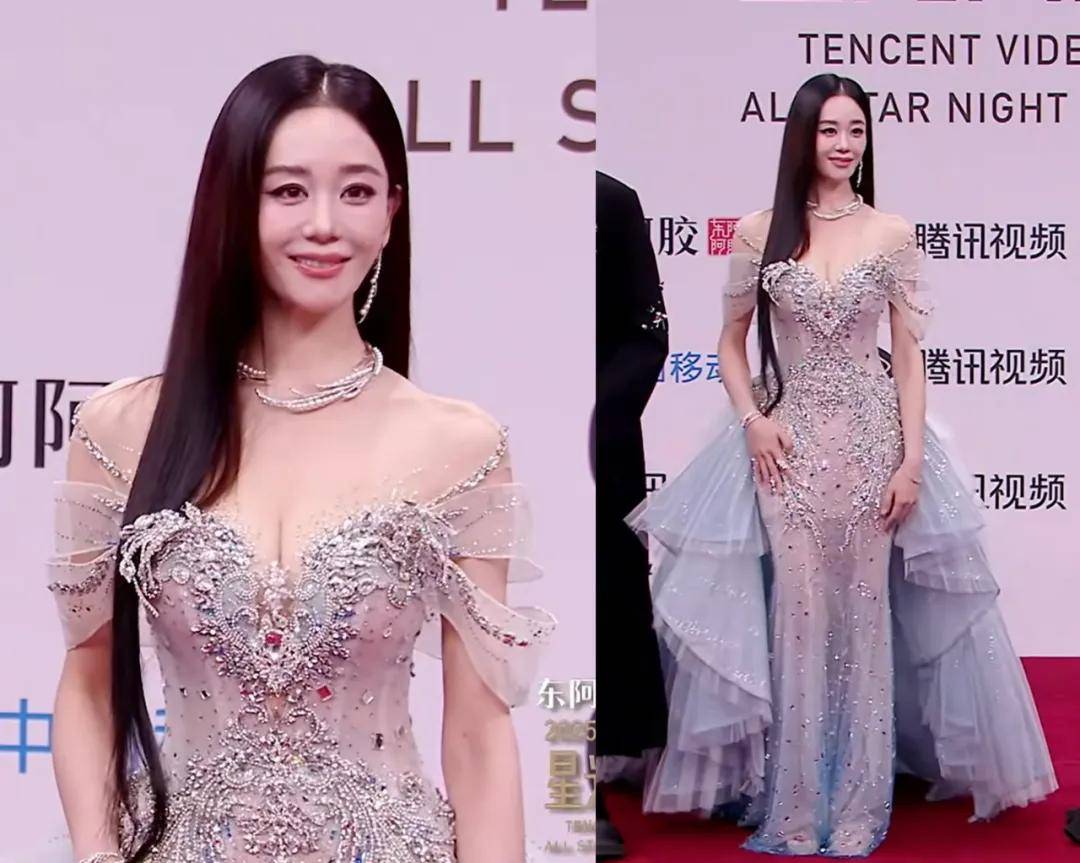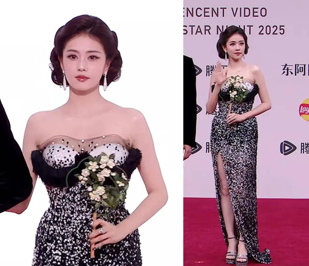 童瑶的妆发温柔大气,就是这条米色纱裙的设计有点看不懂,那两朵立体玫瑰花换个位置会不会没那么奇怪?