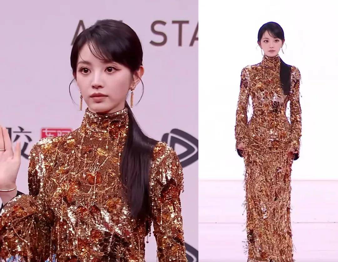 继上次的豹纹长裙之后,田曦薇又穿了一条不适合她的金色亮片高领长裙,按理说这种裙子更适合成熟的女明星,在她身上太像年轻女生偷穿妈妈年轻时的衣服了。