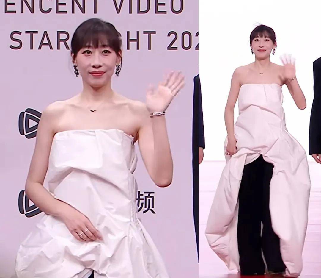 任素汐穿了一套黑白裙裤礼服,只看上半身的话有点像裹了一床轻盈的被子,全身照看起来更像提着被子在走路。虽然黑白配色的礼服基本上不会出错,但这设计同样有点看不懂了。