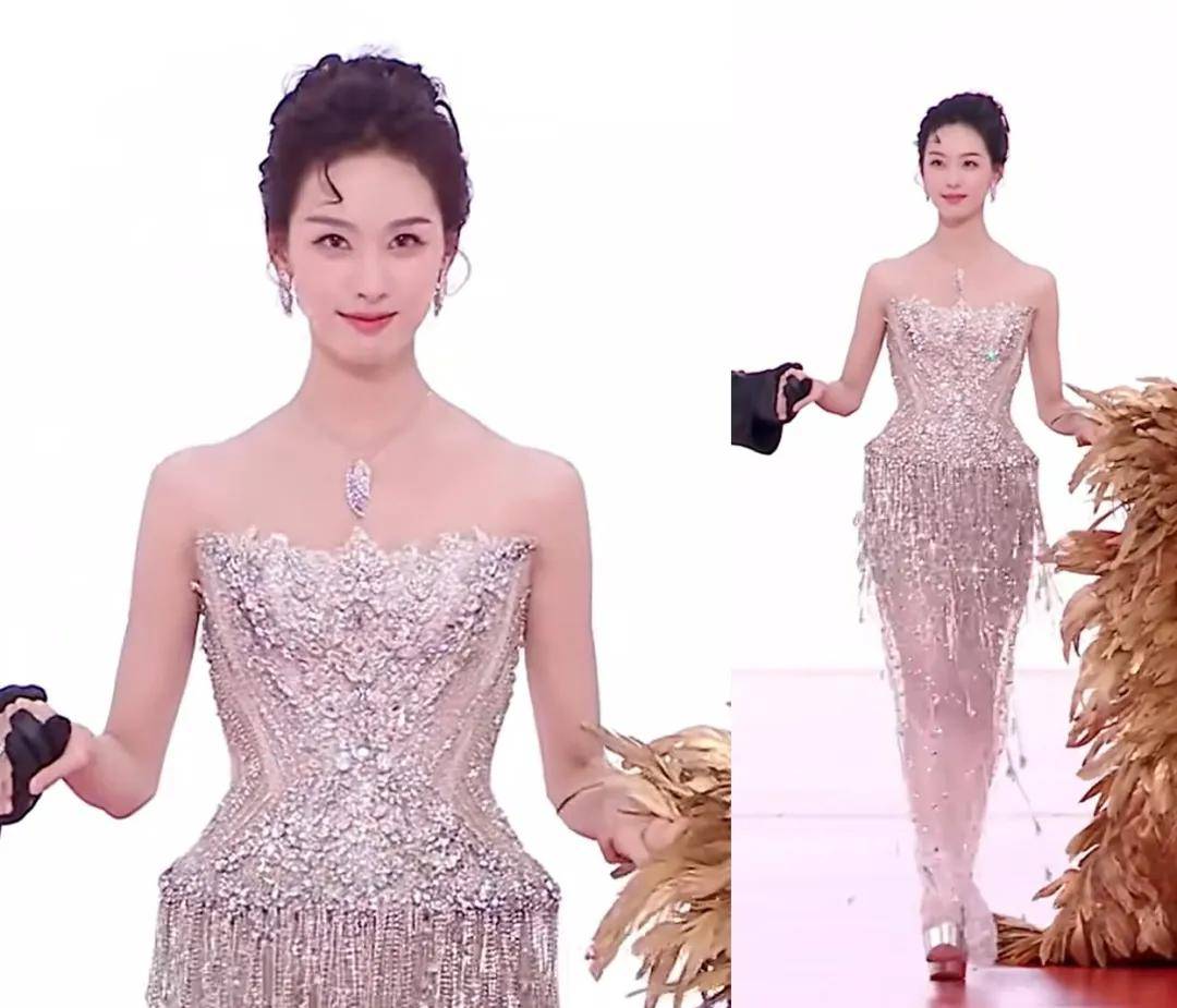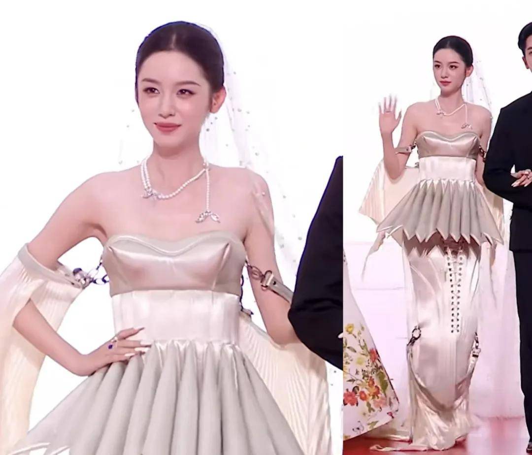 紧接着我们来看第三位打扮得像新娘的女明星——周也,她穿了一条腰间有宛若屋檐的立体装饰的金属色抹胸长裙,搭配长到拖地的头纱,呈现出一个年轻漂亮又自带贵气的新娘形象。