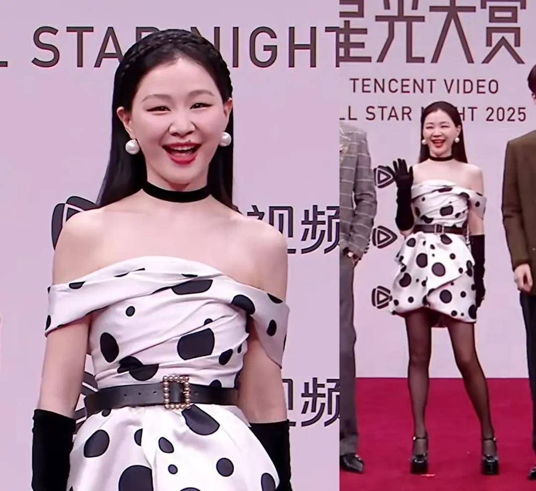 中等身高的金靖,选了一套短款礼服——波点抹胸短裙搭配厚底高跟鞋,拉长了腿部的比例,但如果换个轻盈一点的发型,应该会更好看。