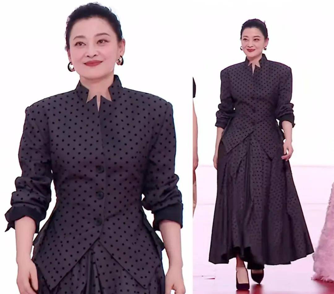 梅婷穿了一套灰色波点裙装,搭配清爽的盘发和提气色的红唇,全身上下都散发着高级大气的美。