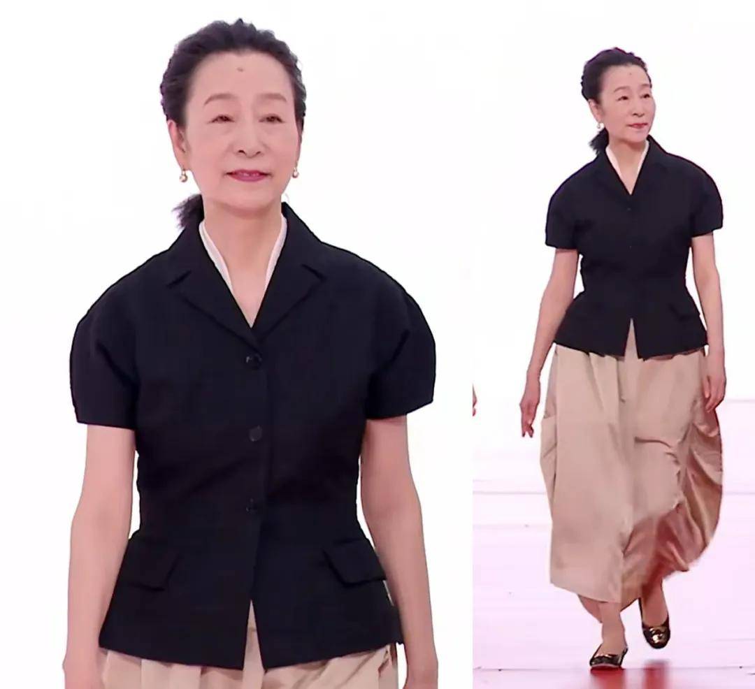 奚美娟穿得比较休闲,是一件黑色短袖上衣配浅棕色半身裙,休闲的服饰难掩优雅的气质。