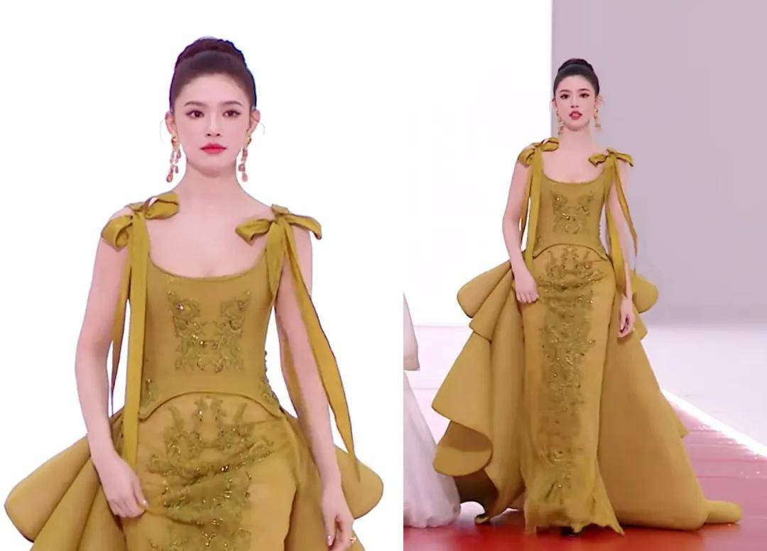 林允以往的红毯造型总是让人赏心悦目,但这次的黄绿色裙子真的很难夸出口,颜色太沉不适合她。