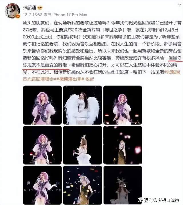 舆论不断发酵下,张韶涵发布微博:我知道安全牌当然比较容易,持续改变或许有很多风险,但墨守陈规就不是百变的我啦…相信新鲜感也从不会在我的生命里缺席~