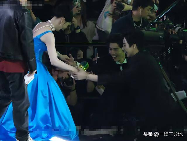旁边两人保驾护航,中间人一脸无奈又宠溺,大家红毯的画面确实对观众眼睛很好。