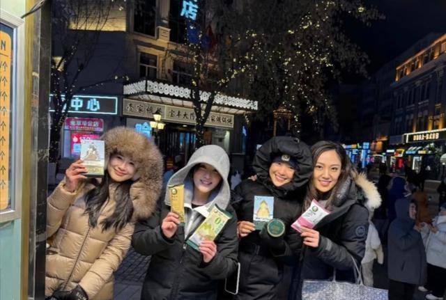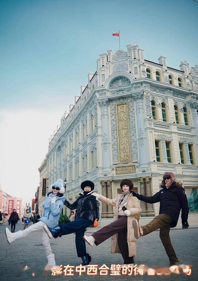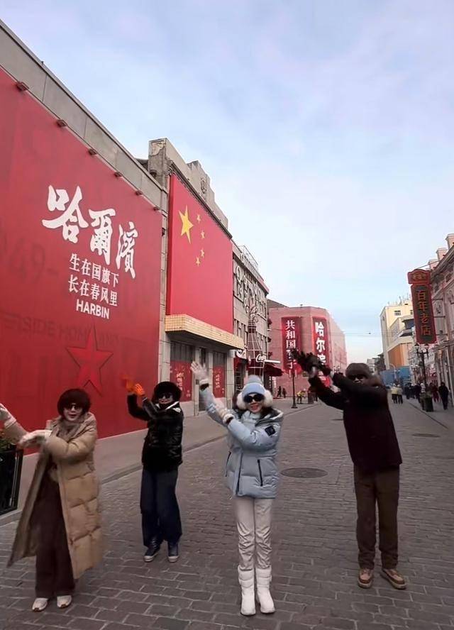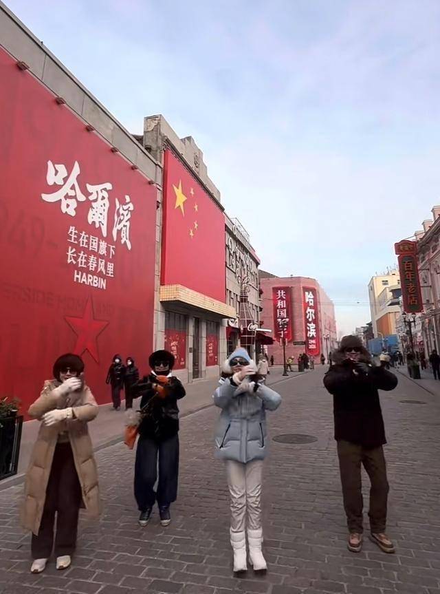 她的弟弟同样戴一顶帽子,黑色羽绒服搭配卡其色裤子,脚穿运动鞋,还戴上了黑色手套。他们四个人在哈尔滨的街头合影留念,画面和谐又温馨。