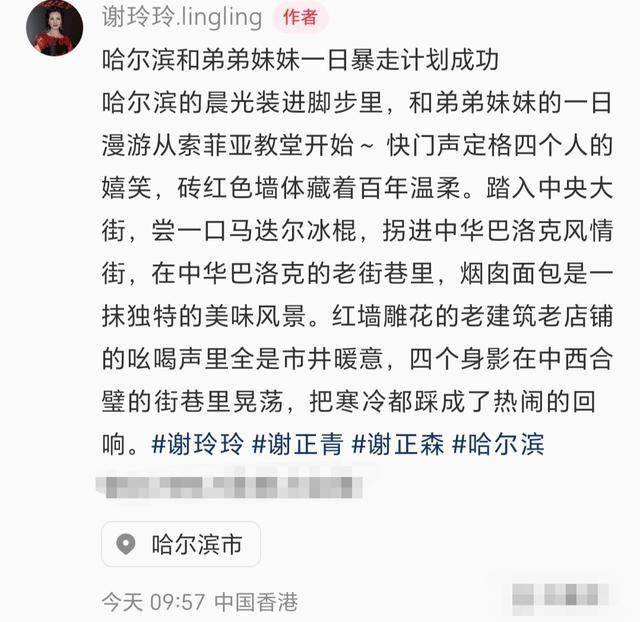 而这次一起来的是她的妹妹和弟弟。今天(12月22日),谢玲玲在社交账号晒出游哈尔滨的动态,他们一行四个人逛了索菲亚教堂、中央大街等地方,玩得很是开心。
