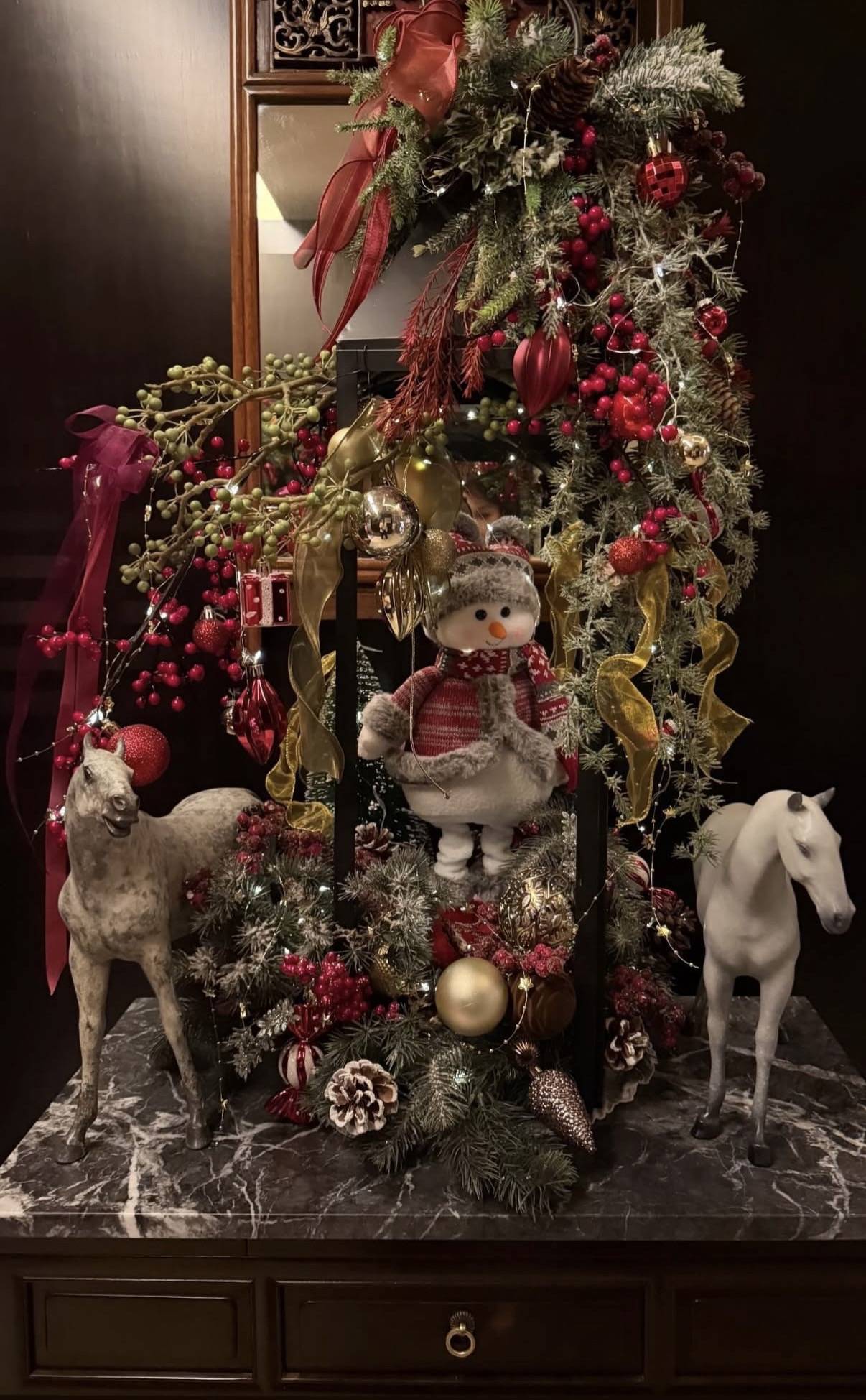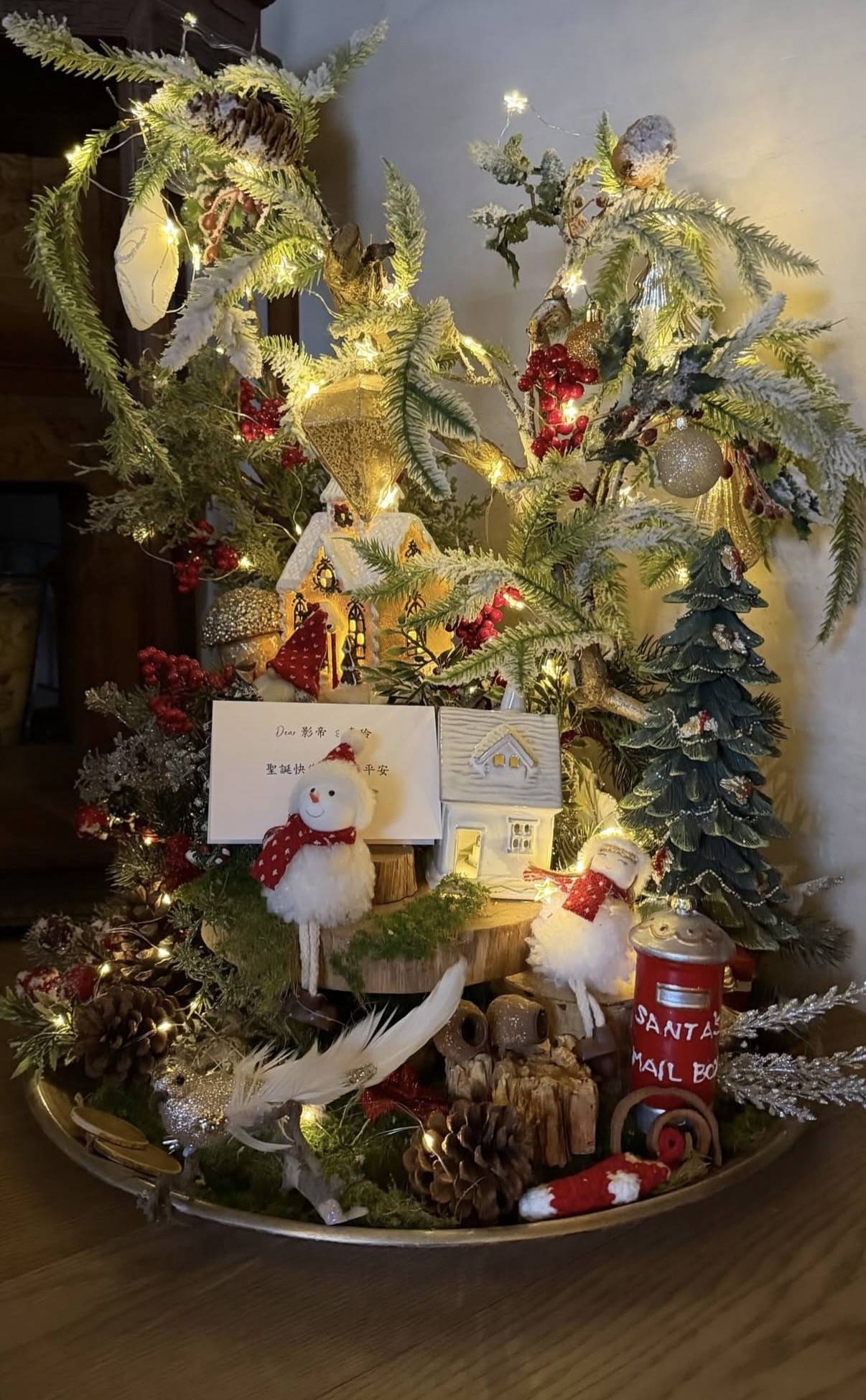 除了这棵圣诞树外,刘嘉玲在豪宅的其他地方还摆放了其他的圣诞装饰物,在桌子上放置了一盆圣诞装饰物。之所以用一盆来形容,那是因为就是用一个盆子来装的圣诞饰品,上面有雪人,有松果,有圣诞树,圣诞屋,非常迷你却也很精致——里面还有一张卡片,是写给梁朝伟与刘嘉玲,想必就是品牌方送来的。另外还有一个摆放在类似梳妆台上的中型圣诞饰品,这个饰品也很好看,看起来也是相当豪华与精致。