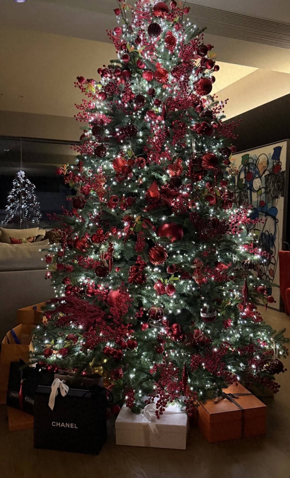 刘嘉玲在社交平台上晒出了为市值两亿的复式豪宅装饰圣诞物的照片,最显眼的就是放在大厅中,沙发背后的那一棵至少高两米的圣诞树。每一年圣诞节前,在豪宅的同一个位置,刘嘉玲都会摆放这么一棵圣诞树,不同的是圣诞树上的装点各有细节。2025年她家中的圣诞树以红色为主,以绿色的叶子为背景,上面挂满了深红色的苹果、铃铛、果子,再配上白色的小串灯,而在圣诞树下还摆放了各种品牌的礼物盒,其中以橙色的盒子居多,整体看起来冲击力还是颇大的。