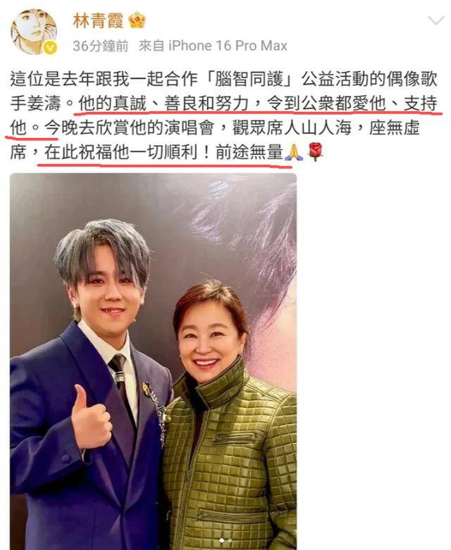 这次帮姜涛宣传演唱会时,林青霞也特意强调他“真诚善良又努力”,说大众之所以喜欢他、支持他,就是因为这些品质,而自己也是其中之一。
