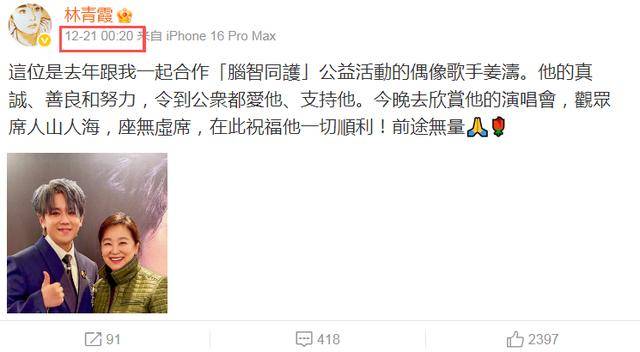 从这张同框照和动态文字就能看出来,林青霞能去看这场演唱会,心情是真的激动。她不仅全程兴致勃勃,还特意发文帮姜涛宣传,说尽了好话,就想把这份喜欢分享给网友。