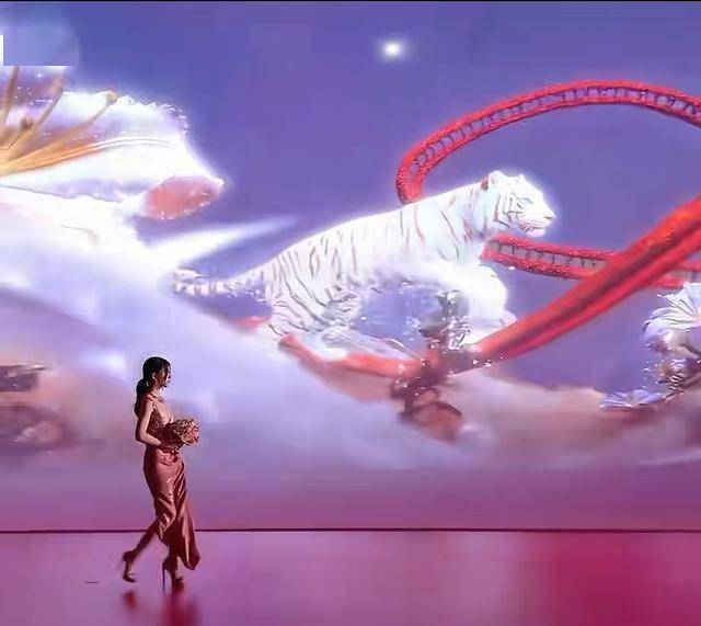 当天,她身穿粉色露肩鱼尾裙,搭配宝格丽全球孤品瑰色宝石,与大荧屏上一只飞跃彩云的白虎,一同缓步登场,脸上淡然冷傲,好似落入凡尘的神女。