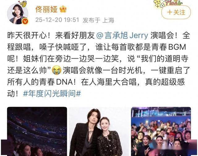 就在12月19日的上海“恒星之城”演唱会上,佟丽娅的现身直接点燃了全场。一身黑色亮片露脐装搭配紧身牛仔裤的丫丫,化身头号迷妹全程跟唱,嗓子都快喊哑了。看着台上那个身穿黑色西装配V领马甲、年过五十依旧帅气逼人的言承旭,佟丽娅和闺蜜一边哭一边笑:“我们的道明寺,还是这么帅!”这种“女神也为男神沦陷”的现场,隔着屏幕都让人感到热血沸腾。