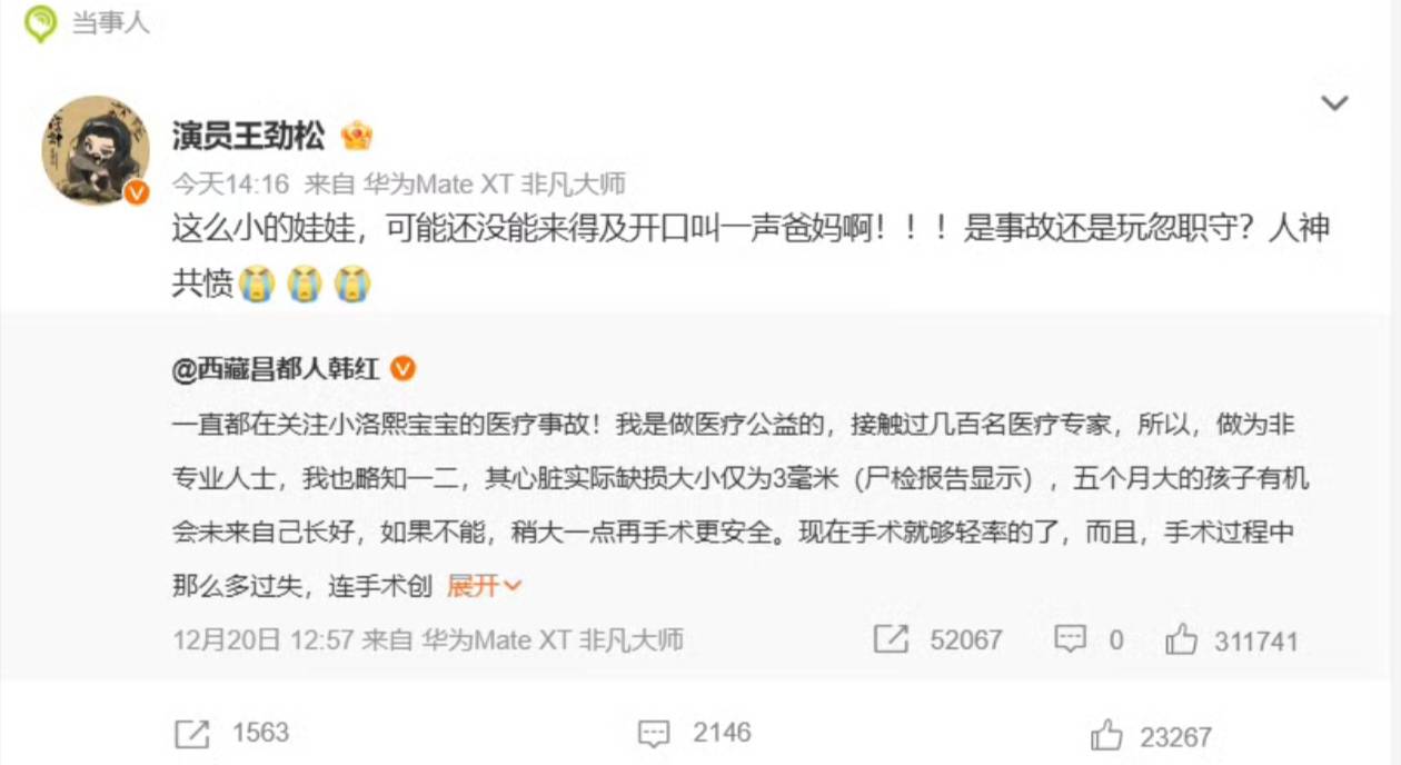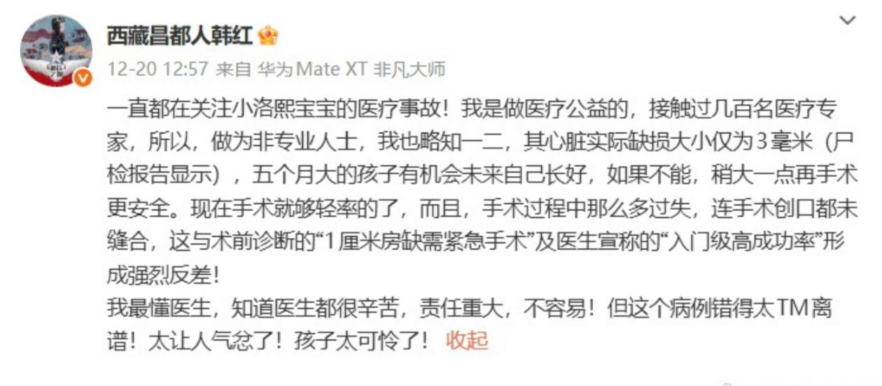 事情要从12月20日说起,韩红在社交平台发文称一直在关注小洛熙宝宝的医疗事故。作为医疗公益人,韩红表示最懂医生的辛苦和责任重大,但这次"错得太离谱!太让人气忿了!孩子太可怜了!"这波发言直接让#韩红为小洛熙发声#话题热度飙升。