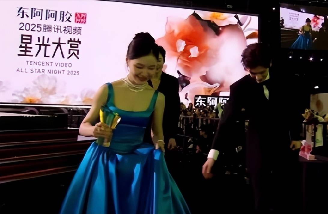 星光大赏金靖当晚,金靖身着蓝色重工礼服惊艳亮相,领奖后下台时,过长的裙摆和超高的高跟鞋让她步履维艰。就在她刚走到台阶处的瞬间,坐在前排的张凌赫和刘宇宁几乎同时起身,两人