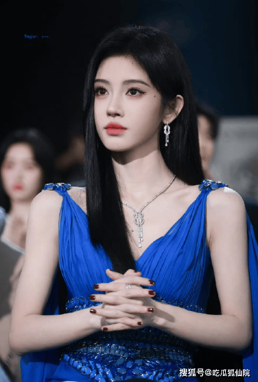 这组造型以蓝色为主色调,宛如将深邃的海洋之色穿在身上。鞠婧祎身着一袭蓝色亮片修身长裙,裙摆不规则剪裁,宛如海浪翻涌,行走间闪耀着粼粼波光。领口的设计独特,似花瓣般环绕颈部,与整体“蓝色妖姬”主题相呼应,凸显出她天鹅般修长的脖颈。