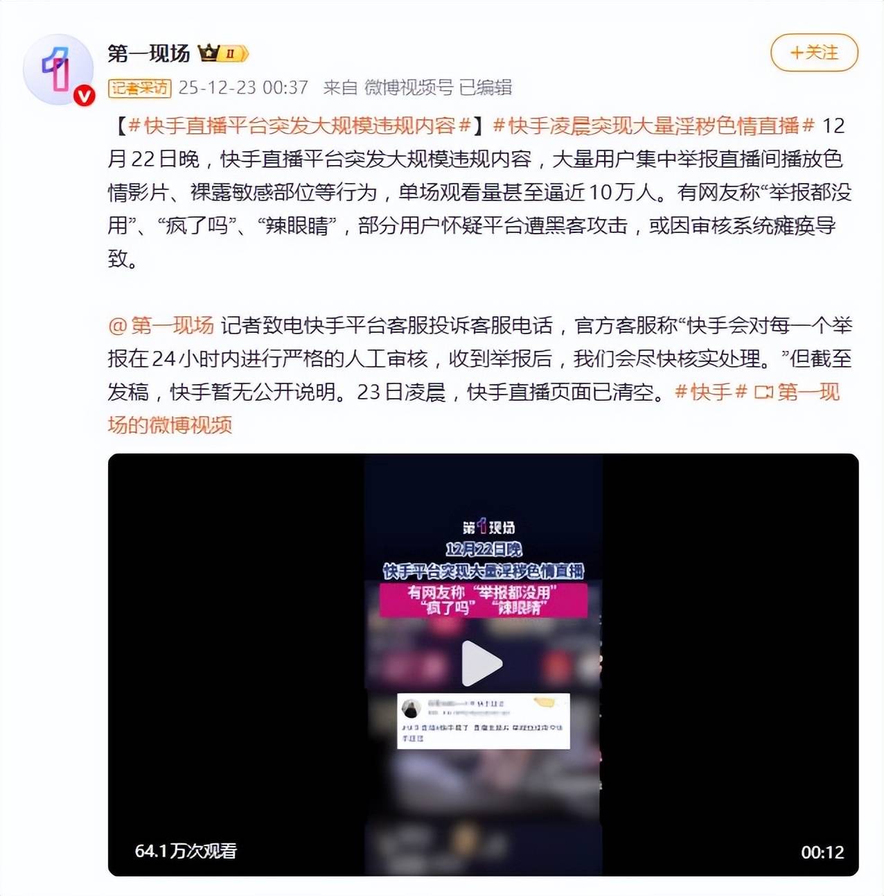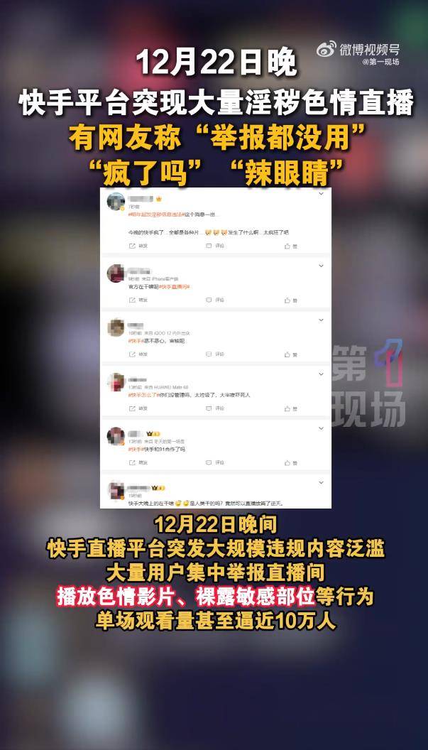 12月22日晚,快手直播平台突然上演了一出“午夜惊魂”,大量用户被涌入眼帘的色情内容惊掉了下巴。直播间里播放淫秽影片、主播大搞擦边低俗表演,有的房间观看人数甚至逼近十万,评论区瞬间被“举报都没用”、“疯了吗”、“辣眼睛”的惊呼刷屏。这场突如其来的“视觉冲击”,让快手在深夜冲上了风口浪尖。