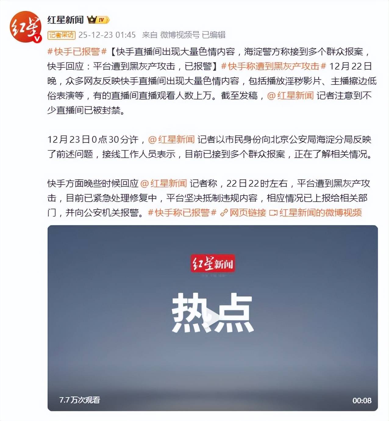 面对用户海啸般的投诉和举报,快手回应在22日22时左右回应,监测到异常,随后将这场混乱定性为“遭到黑灰产攻击”,并启动紧急修复。平台方面强调坚决抵制违规内容,并表示已上报情况并向公安机关报警。截至23日凌晨,直播页面已被清空,留下一地鸡毛和无数问号。