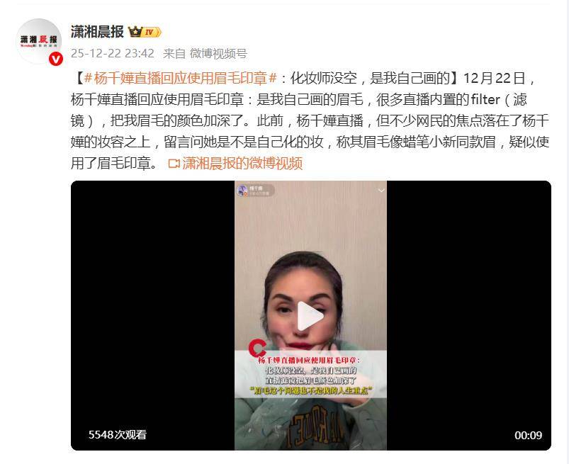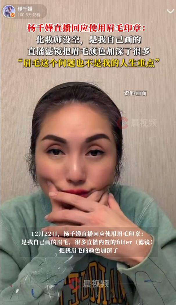 眼看讨论愈演愈烈,杨千嬅在12月22日火速开启直播亲自回应。她一句“是我自己画的眉毛”,干脆利落地否认了使用工具,随后将“锅”甩给了直播滤镜:原来是因为化妆师不在,她自己动手,结果直播内置的filter(滤镜)自动把眉色狠狠加深,这才酿成了“蜡笔小新眉”的乌龙。她还幽默承认化妆技术有待提高,已经去请教了专业人士,并透露自己平时其实更爱淡妆,这次只是心血来潮的尝试。