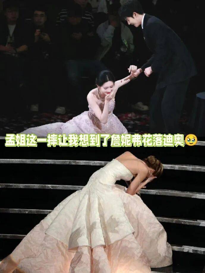 网友称孟子义摔倒,神似詹妮弗·劳伦斯2013年奥斯卡颁奖礼摔倒的经典画面。
