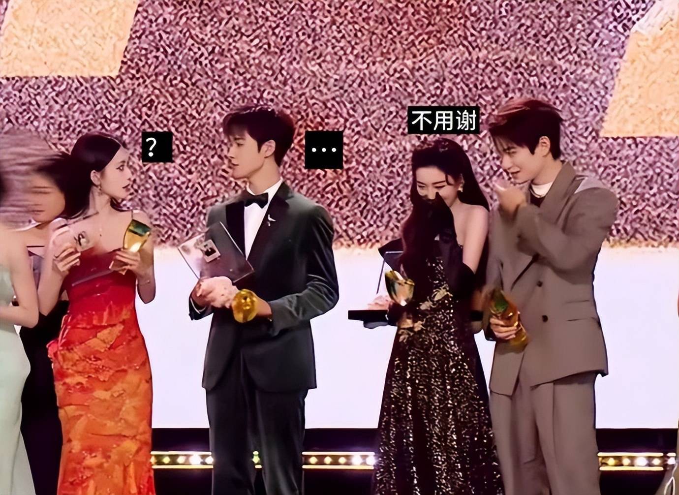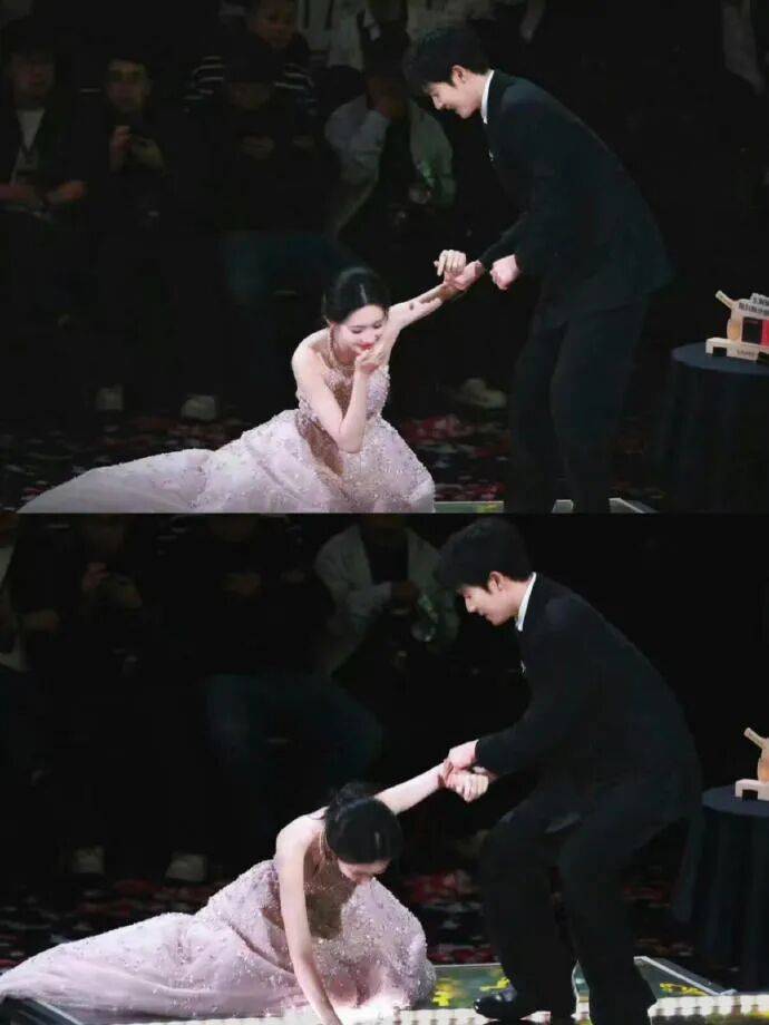 同台的白鹿惊呼捂嘴,丞磊转身试图协助,四人最终手拉手并排行进下台。台下丁禹兮因惊吓隔空伸手“抢救”,动作幅度惊动邻座鞠婧祎,形成反差喜剧效果。