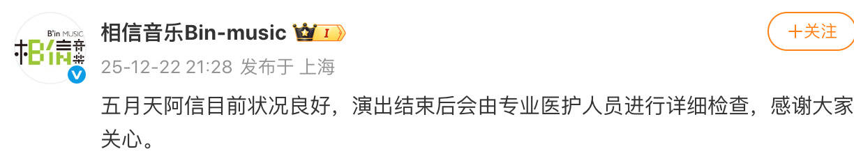 22日晚,相信音乐发文替阿信报平安:“五月天阿信目前状况良好,演出结束后会由专业医护人员进行详细检查,感谢大家关心。 ”